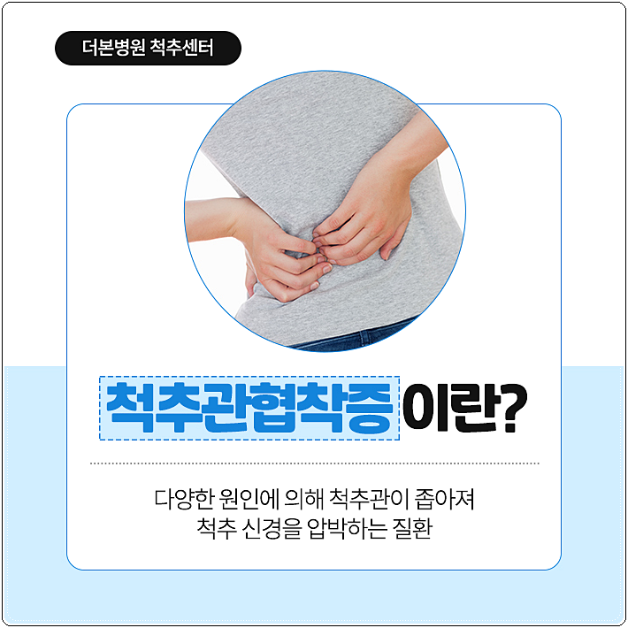 척추관협착증은 척추에 생기는 대표적인 퇴행성 질환입니다. 우리 몸은 나이가 들면 인대, 근육 등의 조직이 약해지고 척추뼈와 인대는 점차 비대해지는데요. 이로 인해 척추뼈 안쪽에 각종 신경과 척수가 지나가는 통로인 척추관이 좁아지면서 신경을 압박하여 허리 통증을 유발합니다. 이때 압박당한 신경은 하체까지 연결되어 있기 때문에 허리 통증뿐만 아니라 다리가 저리고 당기는 하지방사통까지 유발합니다.